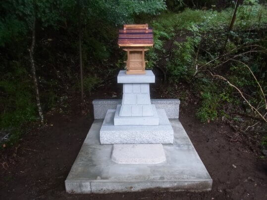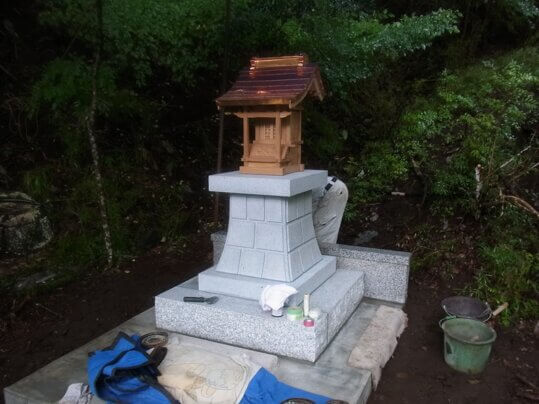 高さ、方角などをお施主様と相談してまずは基礎工事です。奥に見える石の祠を今回作り直します。