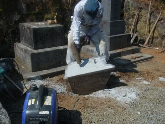 こんにちは、今日も暑いですね。長期予報では今年は熱いが長引くらしい。小まめに水分補給して熱中症対策をしましょうね。そして現場の様子ですがまたまたお墓の解体工事です。最近この仕事本当に多くなってきましたね。下の写真は運搬車が側まで来ないので石碑を割っています。小さくしてネコで運び出します。