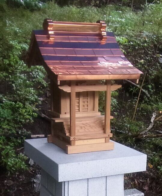 石の天場石とお社の土台の間にゴム板を四方にかましておきます。直接置くと石の水分を木が吸って腐りやすくなるといけないので。