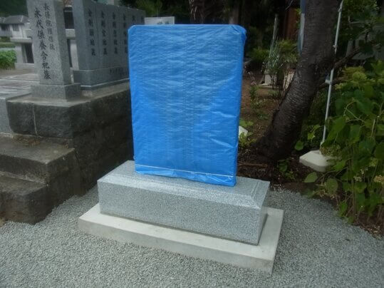 こんにちは今日は午前中曇り空でしたので涼しかったが日が出ると気温が上がって暑い。温暖化恐るべしですね。さて先週の現場ですがお墓が仕上がりました。開眼供養式があるまで白い布をかけておきます。