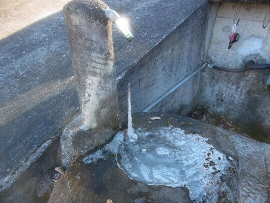 その墓地にある地下水が自噴している水道。凍って逆つららが出来ていました。