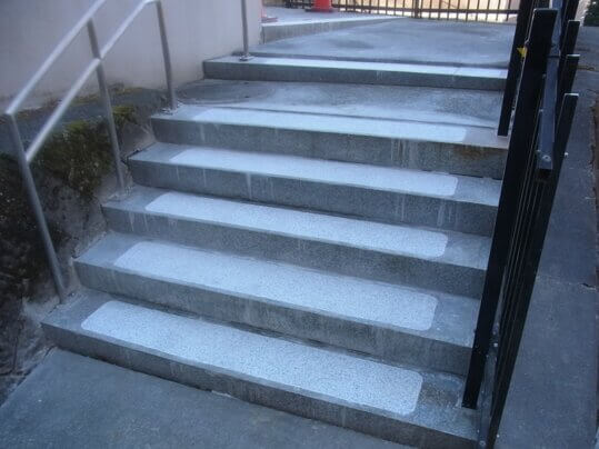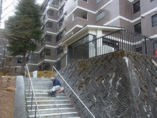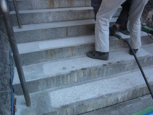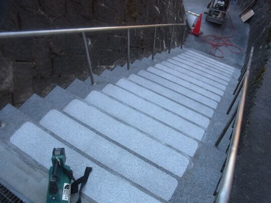 こんにちは、昨日までは寒かったですが今日は寒さも緩んで作業がしやすかったですね。山中湖村でお仕事でしたが昨日までは大変でした。この現場マンションの住人が石の階段が滑って危ないという事で天場を粗す作業です。まずはカップ刃で輪郭線を付けます。