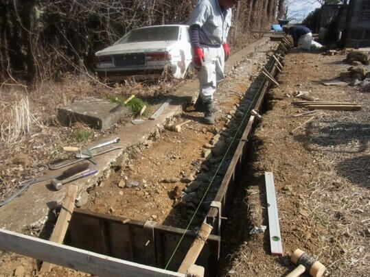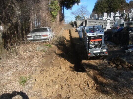 こんにちはここ何日は暖かいですね、現場仕事が捗ります。そして仕事の方は墓地の中の参道をコンクリート舗装させていただきます。まずは床掘、80㎝幅で作っていきます。