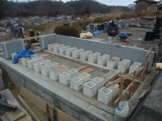 おはようございます。今朝は冷え込みも和らぎ工場の寒暖計はマイナス2度ほどでしたね、水道の水も出ましたし。でも週末また寒くなるようですから水道管の破裂など気を付けましょう。衆議院議員選挙もありますね。さて現場のお仕事ですが以前基礎コンクリートを打設した樹木墓、型枠を取りました。この後個々の部屋を造っていきます。